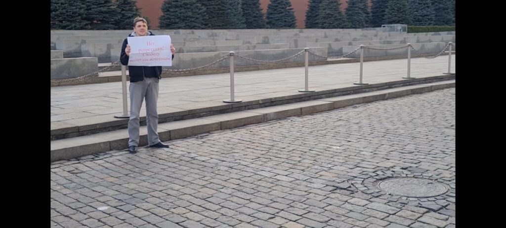 Я вышел на Красную площадь с плакатом «Нет репрессиям! Свободу политзаключенным!» Не прошло и пяти минут, как прибыл экипаж ППС,после чего меня задержали и доставили в РОВД, где в течении часа составили протокол. После воспитательной беседы о пользе молчания меня отпустили. На суде всё было однозначно: виновен, штраф 10 000.
